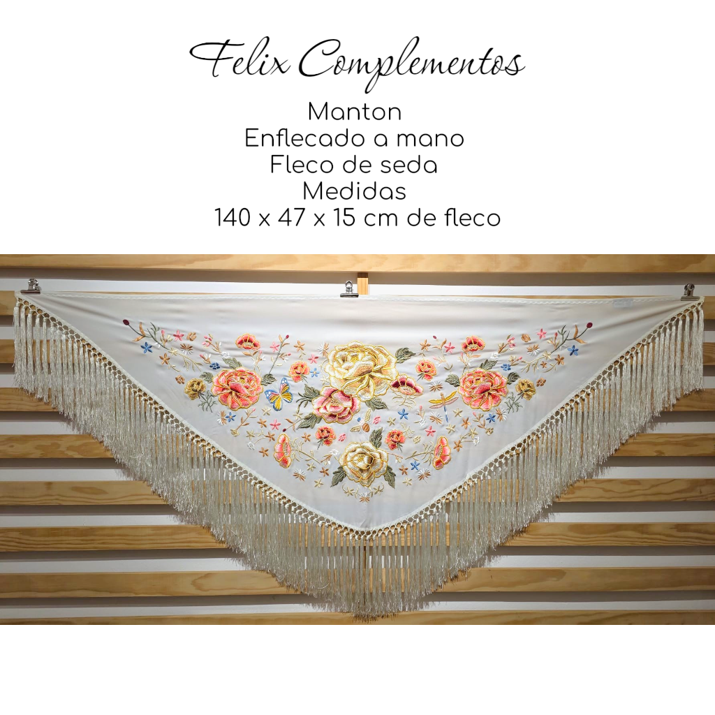 Fleco Extra Largo (15 cm): El gran protagonista de esta pieza. Sus 15 cm de fleco de seda, anudados artesanalmente a mano, crean un movimiento majestuoso. Es un fleco con "mucho peso" y presencia, que hará que cada paso y cada baile sea un espectáculo.