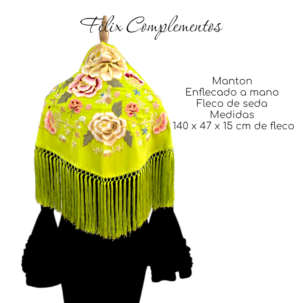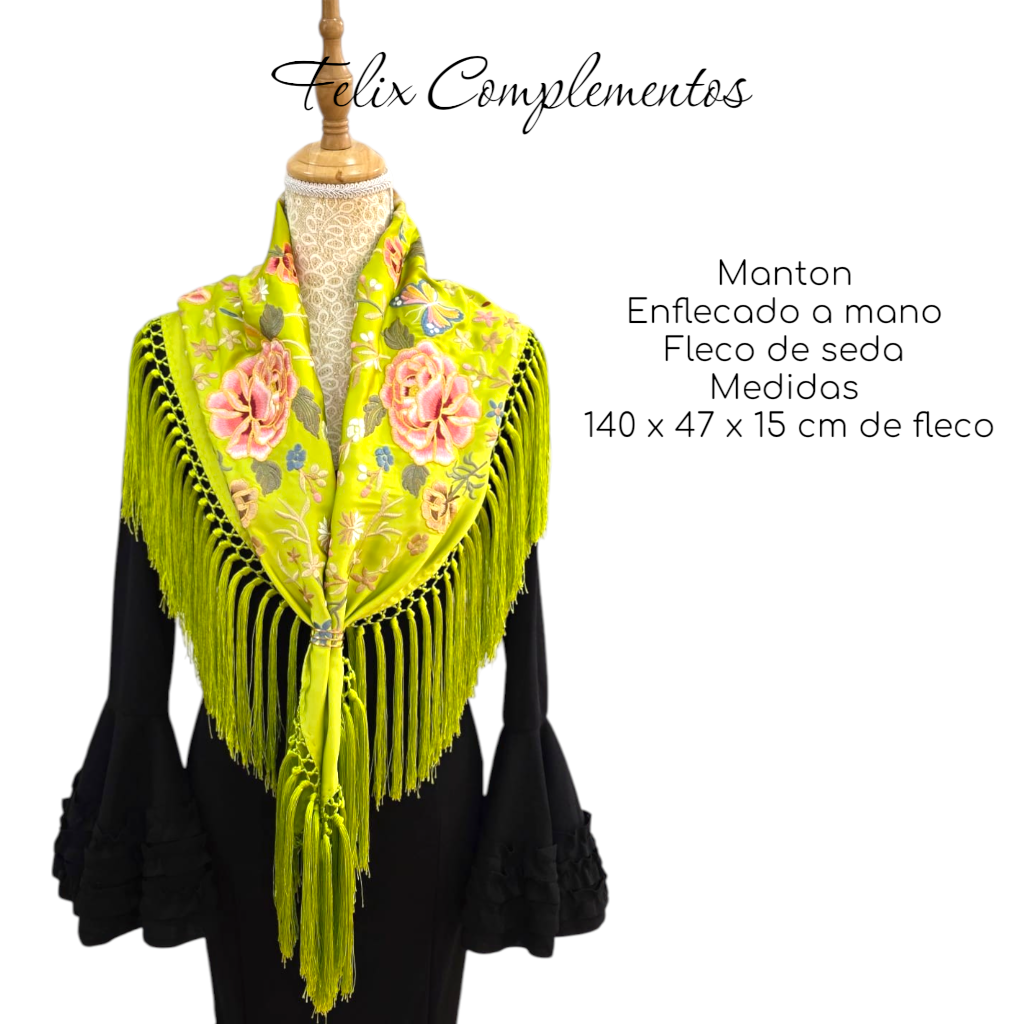 Fleco Extra Largo (15 cm): El gran protagonista de esta pieza. Sus 15 cm de fleco de seda, anudados artesanalmente a mano, crean un movimiento majestuoso. Es un fleco con "mucho peso" y presencia, que hará que cada paso y cada baile sea un espectáculo.