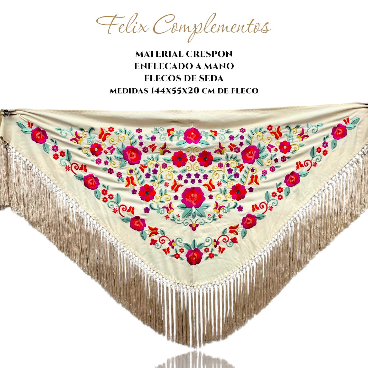 El Mantón de crespón y fleco de seda es una pieza elegante y tradicional mezclado con la modernidad de hoy en día, confeccionada con hilo de seda, lo que le otorga un brillo y una caída inigualables. El crespón añade textura y cuerpo al tejido, mientras que el enflecado a mano realza su valor artesanal, garantizando la calidad de los flecos y el anudado.