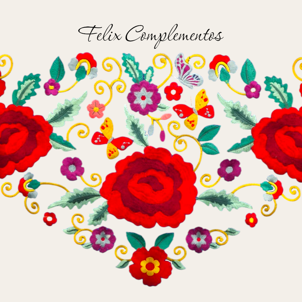 Técnica: Bordado multicolor con diseño central de rosas.