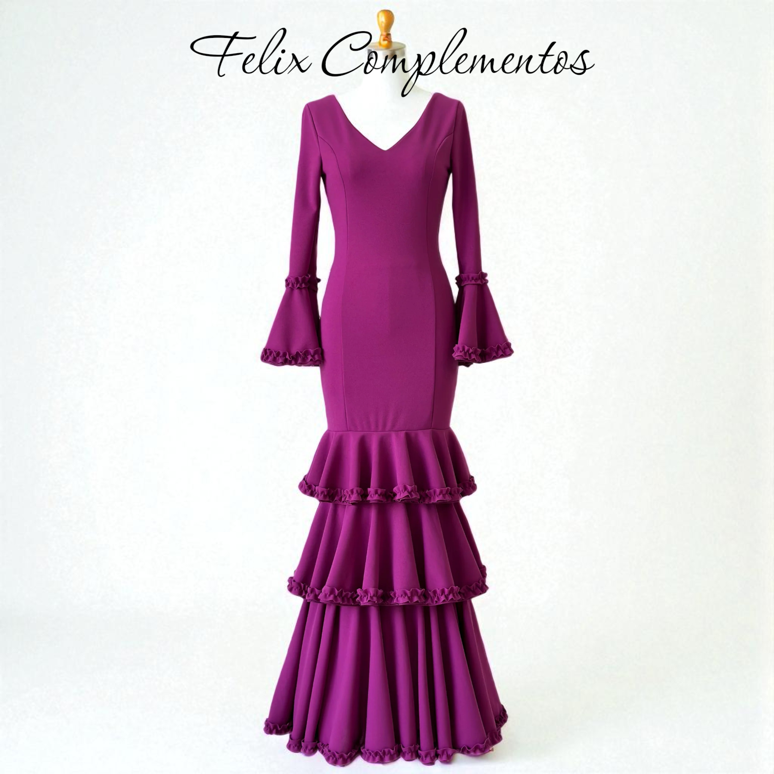Elaborado completamente en un material de punto técnico y elástico, este diseño se distingue por su resistencia y excepcional flexibilidad. Este tejido no solo garantiza que el vestido se adapte perfectamente al cuerpo, sino que ofrece una libertad de movimiento total que es inusual en la indumentaria flamenca clásica.